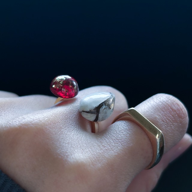 まるで絵画から切り取ったような繊細な模様のルビーインフックサイト(緑)と、漆黒のスピネルを組み合わせたフリーリングです。 ルビーインフックサイトの独特な模様は1粒ごとに異なり、同じ模様のものは二つとございません。 そのため二度と同じ模様のリングを作ることはできず、世界に一つだけの特別なリングでございます。 ※画像の商品をお届けいたします。 光沢のある丸みを帯びたフォルムは手によく馴染み、大粒の天然石をしたことで手元を華奢に見せてくれます。 着け心地も良く柔らかい色合いでありながらもシックな服装との相性よく、落ち着いた印象を与えてくれます。 毎日身につけたくなるアートなリングとのコーディネートをぜひお試しください。 お気に入りの衣装をアクセサリーで傷つける心配もございません。 (丸みのあるフォルムなので、商品自体が繊細な衣装を引っかけて傷つけるという心配がありません) ※稀にリングと指の間に衣類が入り込み、引っかかってしまう場合がございます。薄い布などはスルッと入り込みやすいため特にお気をつけくださいませ。 フリーサイズのオープンリング(フォークリング)は、指に合わせてサイズ調整が可能でございます。リングがキツすぎる、緩すぎるということがなく、煩わしさ・窮屈さを感じません。 リングのオープン部分が装飾部分と通常のフリーリングとは異なり、指の腹にリングが食い込むことなく、ストレスフリーな着心地です。 《ルビーインフックサイト》 ○精神的疲労を癒す ○トラウマや落ち込みから立ち直らせる ○困難に打ち勝つ勇気を与える ○ヒーリング効果が高い ○物事に意欲的に取り組む情熱を与える 《ブラックスピネル》 ○果敢 ○破邪 ○ネガティブなパワーを跳ね返す ○自分らしさを認め書くとなる部分を確立し積極的に行動できるよう導く 【素材】 ブラックスピネル…8×8mm ルビーインフックサイト…14×10mm リング…真鍮、シルバーカラー 【サイズ】 フリーサイズ ※ご自身の指のサイズに合わせて調整できます。 ※サイズ調整の際は、必ずリング本体の金具部分を持ってゆっくりと力を加えて調整ください。天然石(装飾部分)を掴んでサイズ調整をすると破損の原因になります。金属疲労でリング本体が折れる、メッキが剥がれる原因になりますので、最小限の調整に留めるようお願いいたします。 ─────── 配送方法 ─────── ▶ クリックポスト/送 料 無 料 ▶レターパック/有 料 配 送 ※お届け時のサイズによってレターパックライト、プラスのどちらかにて発送いたします。 ─────── 注意事項など ─────── 《天然石について》 天然石によって傷やヒビ割れたような模様がありますが、天然石特有の特性であり、不良ではございません。 唯一無二な天然石の特性や独特な個性をお楽しみ下さい。 《画像について》 実物と差異が無いよう撮影しておりますが、お使いの端末によっては実際の色味と異なる場合がございます。 《商品取り扱いについて》 普段とは異なる使用方法や、商品に対し故意に力を加える、無理に引っ張るなどの行為はパーツ等に負荷がかかり変形・破損に繋がる恐れがございます。 小さなお子様やペットがいらっしゃるご家庭は、誤飲などの事故を未然に防ぐためにも取り扱い・保管には十分にご注意ください。 《キャンセルや返品など》 お客様都合による注文確定後の「キャンセル」や「変更」は承っておりません。 お客様都合による「返品・交換」は承っておりません。お届けした商品に不備などがある場合は、商品お届けから7日以内にご連絡ください。 状況を確認し速やかに対応させていただきます。 ※重要な項目のみを上記へ抜粋しました。その他の注意点につきましては、下記ショッピングガイドをご覧ください。 ・ショッピングガイド https://aishu.theshop.jp/p/00001