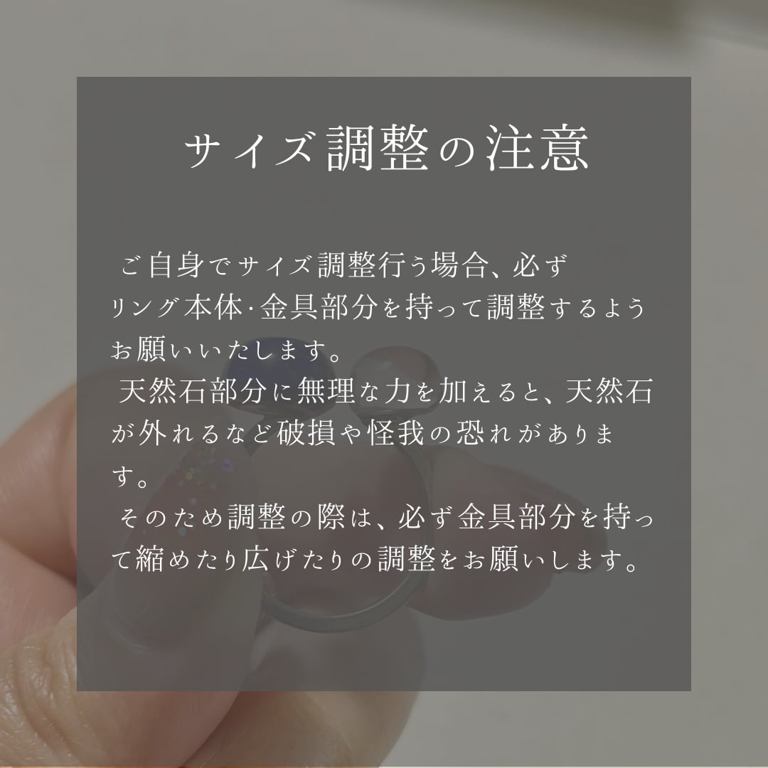 普段利用されてるリングの号数をぜひご選択ください。ご希望のサイズに調整してお届け、同時に天然石の位置も微調整し、美しいリングをお届けいたします。