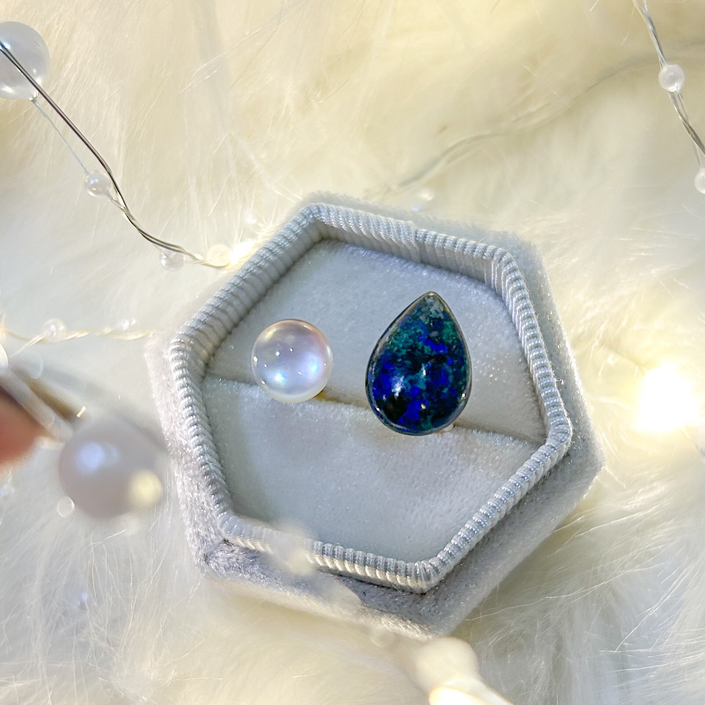 大粒な天然石を使ったリングは、指を細く長く魅せる効果があります。