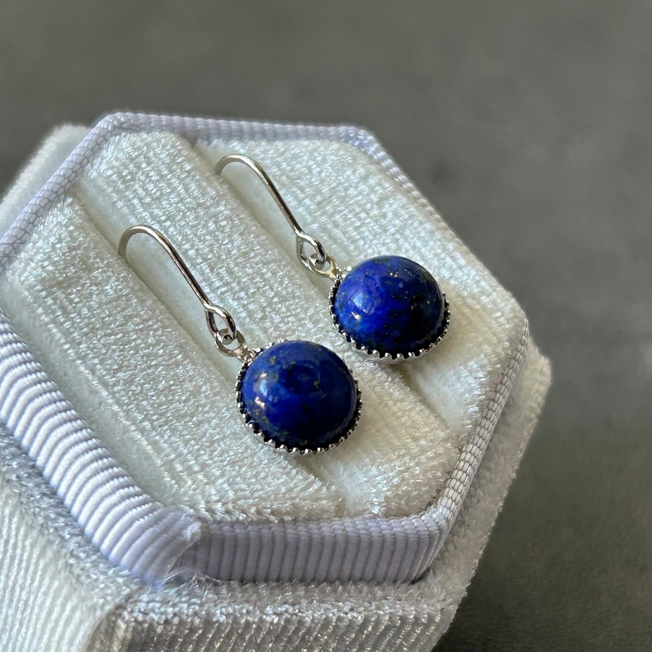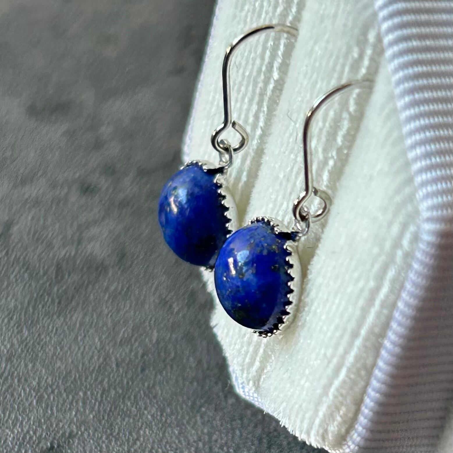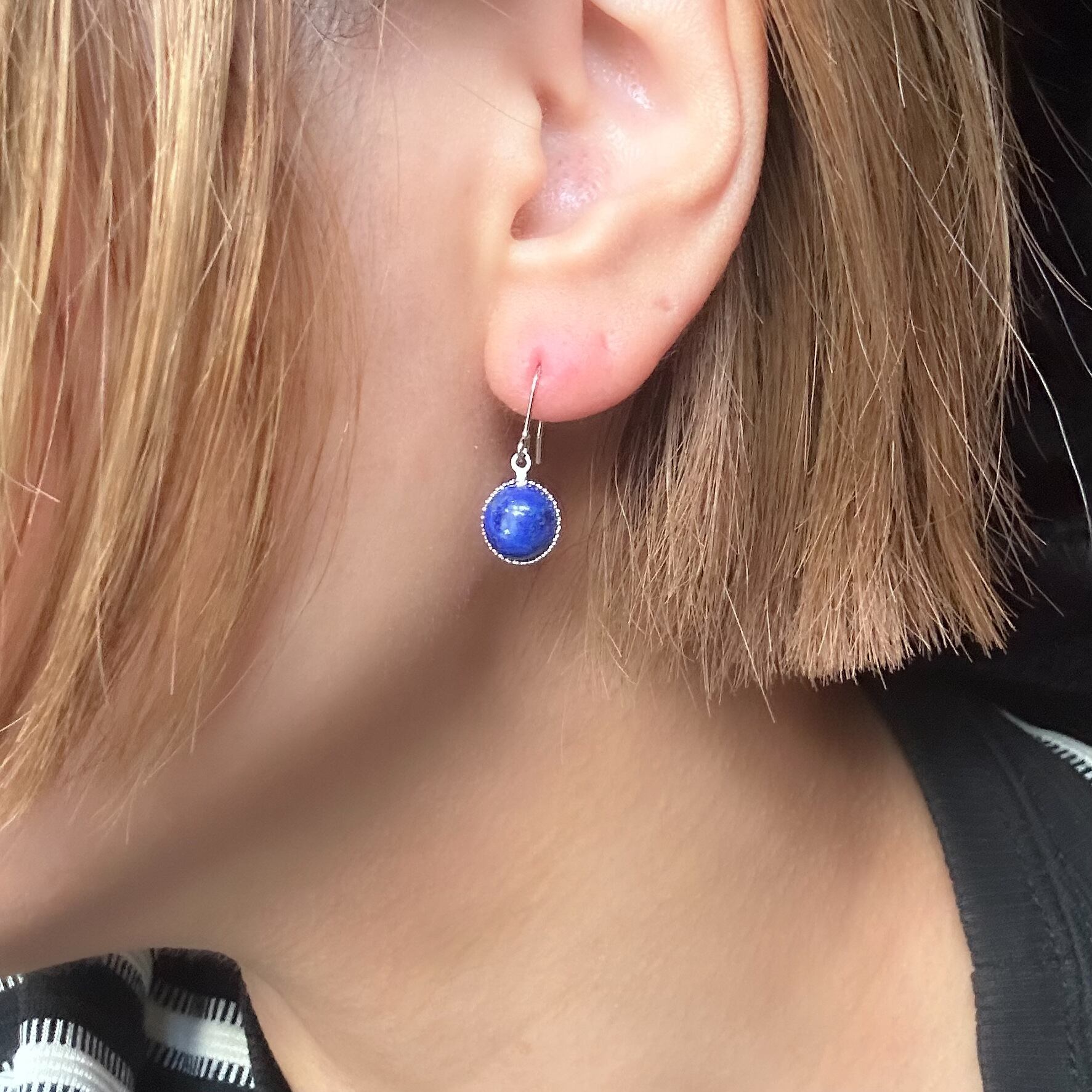 視線を集めやすい耳元には、明るめのラピスラズリをピアスに、