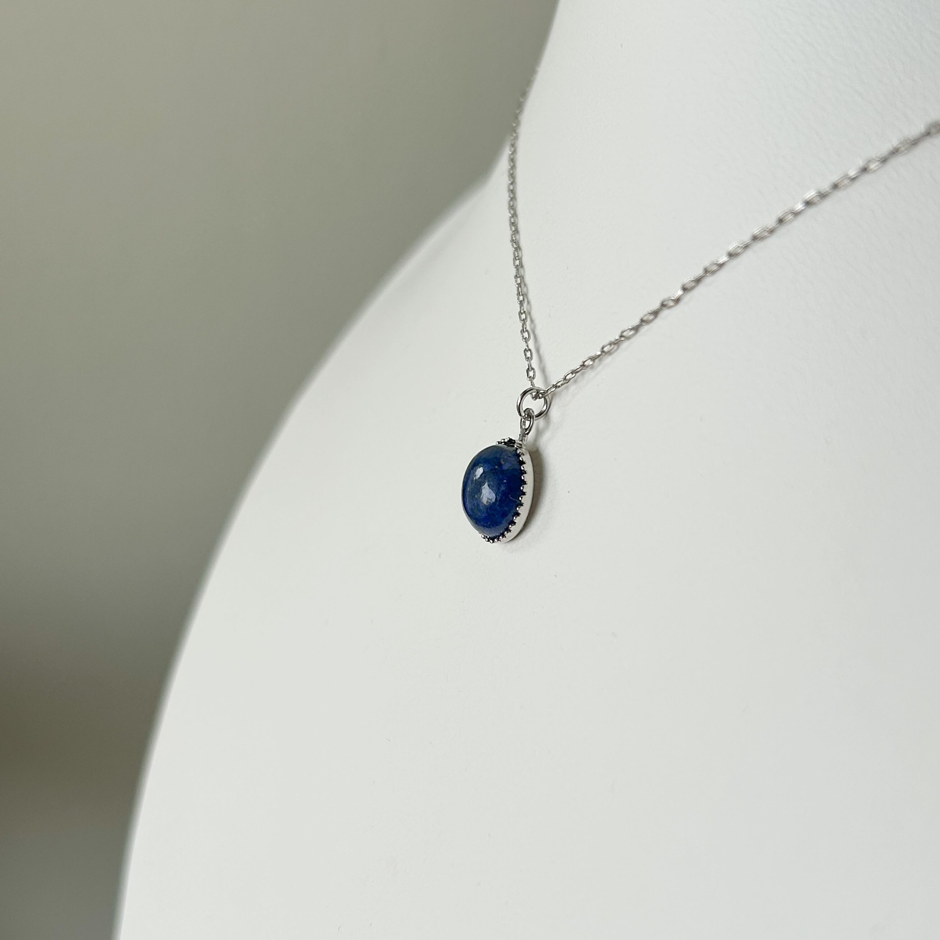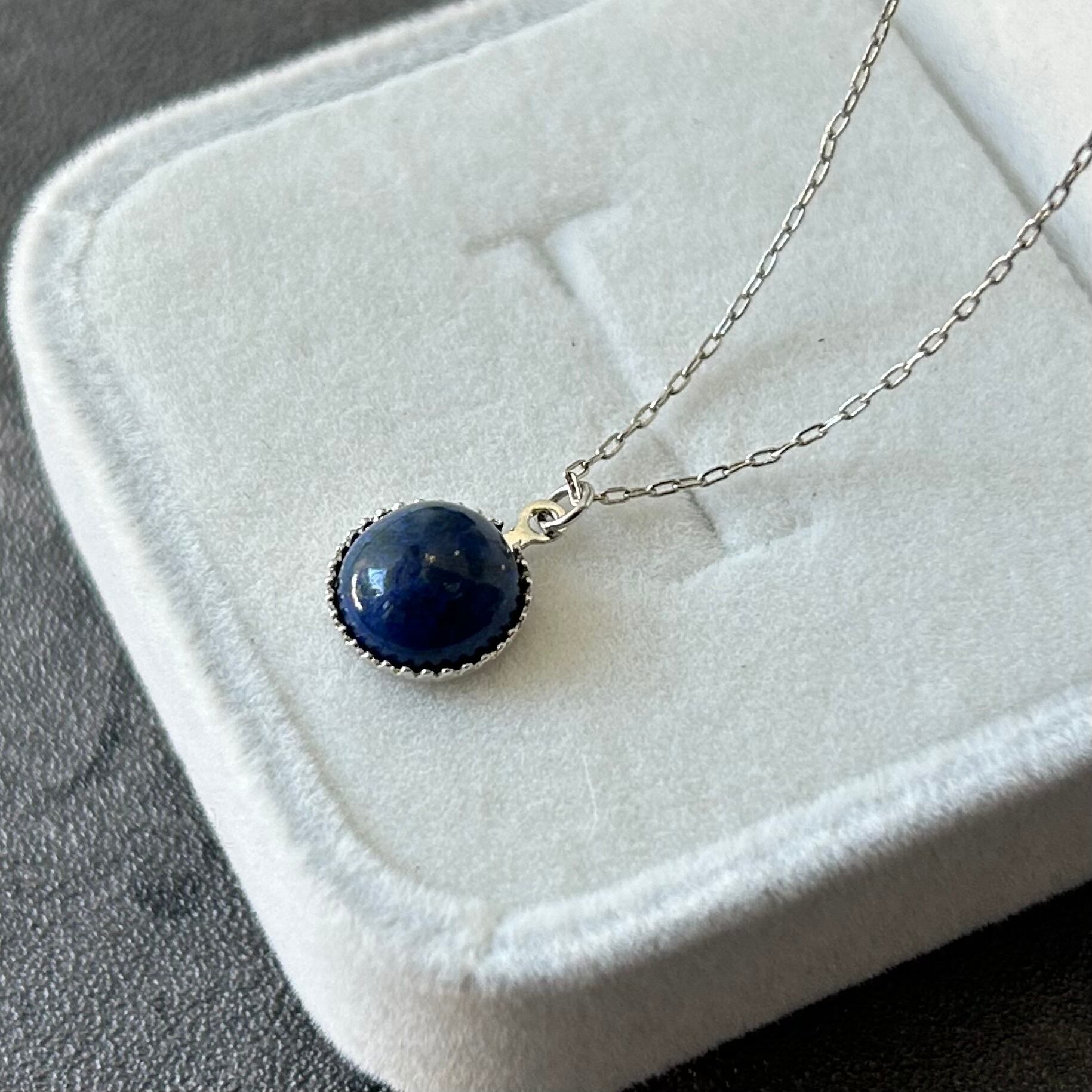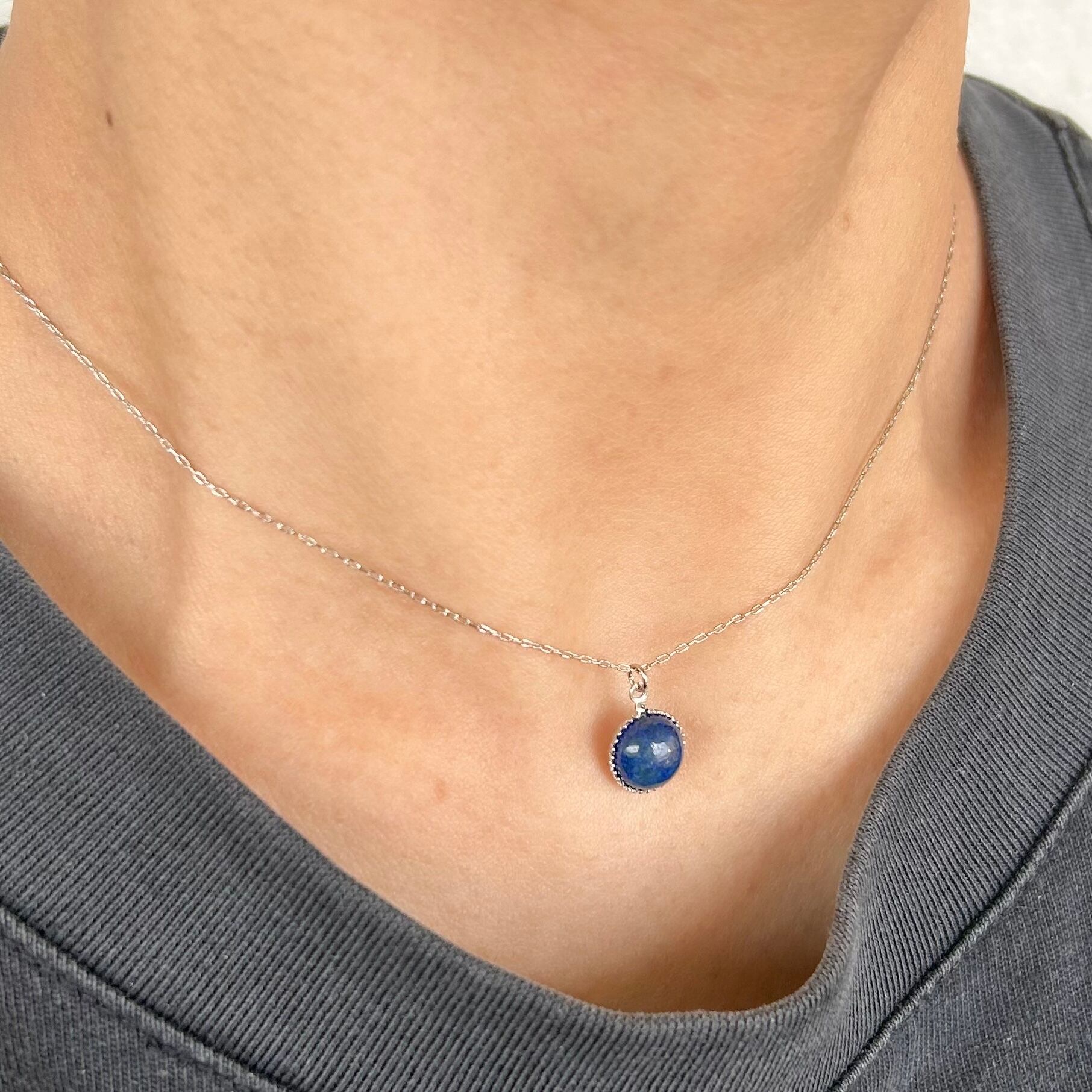 胸元には、少し色味を抑えた控えめの青色のラピスラズリをペンダントトップに使用。