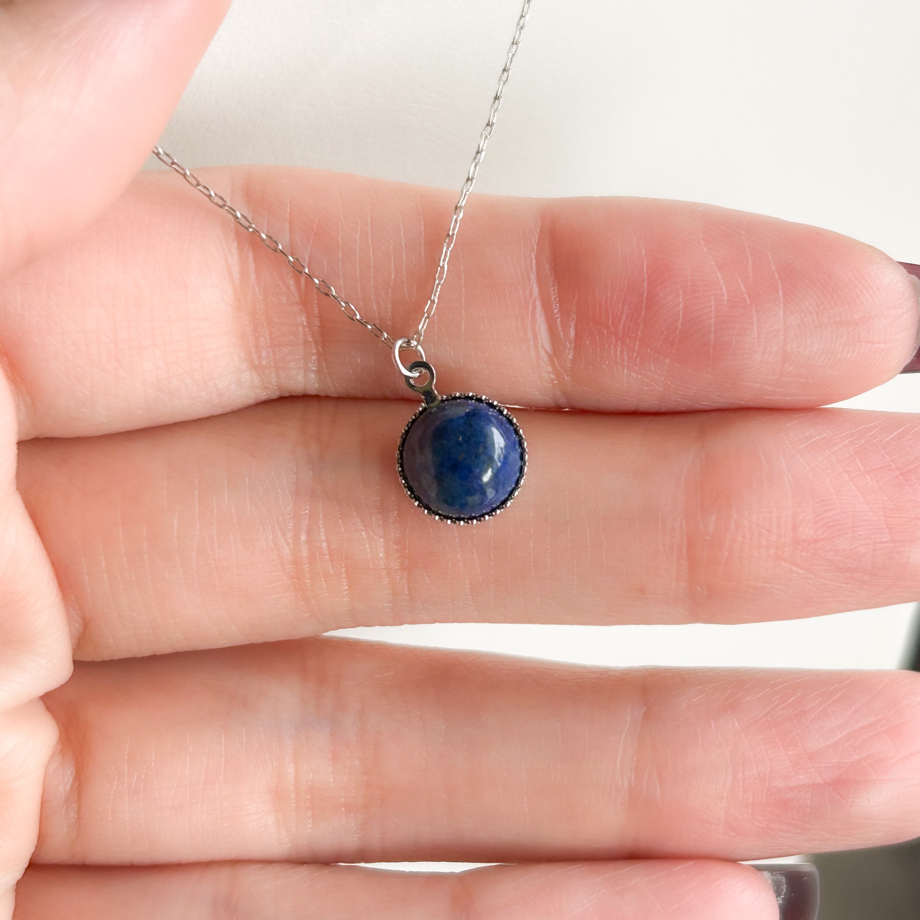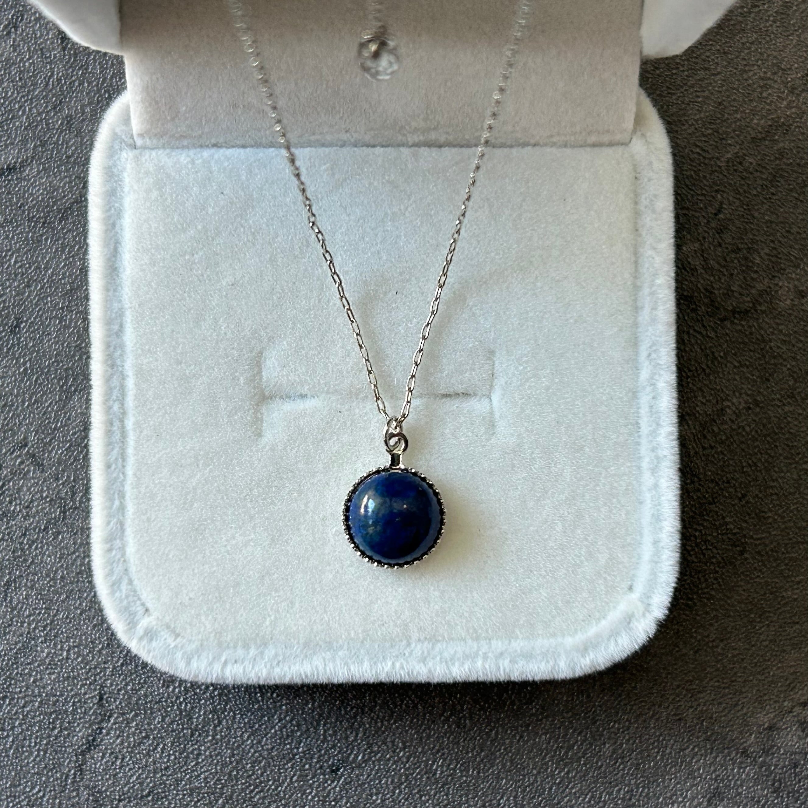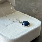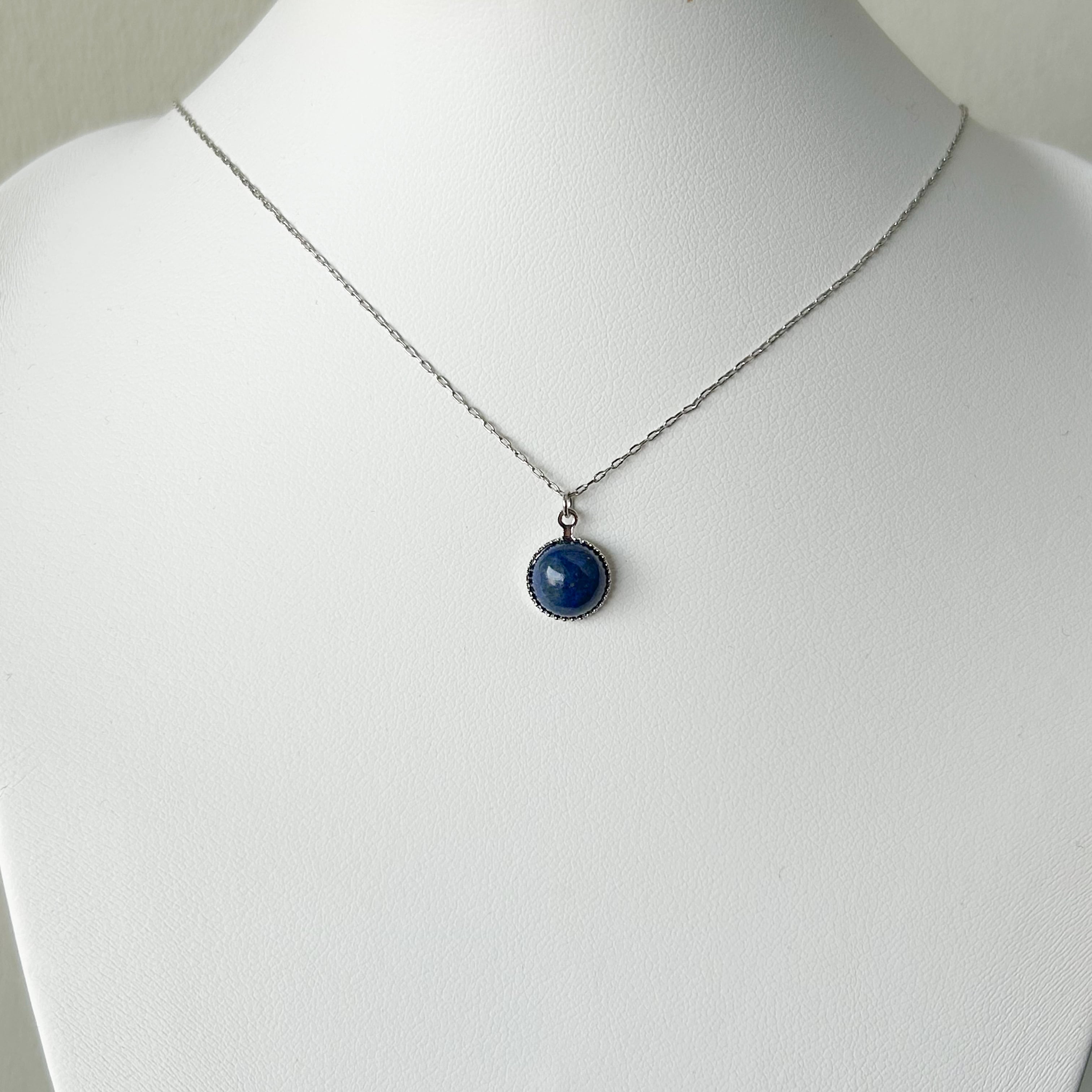 胸元には、少し色味を抑えた控えめの青色のラピスラズリをペンダントトップに使用。