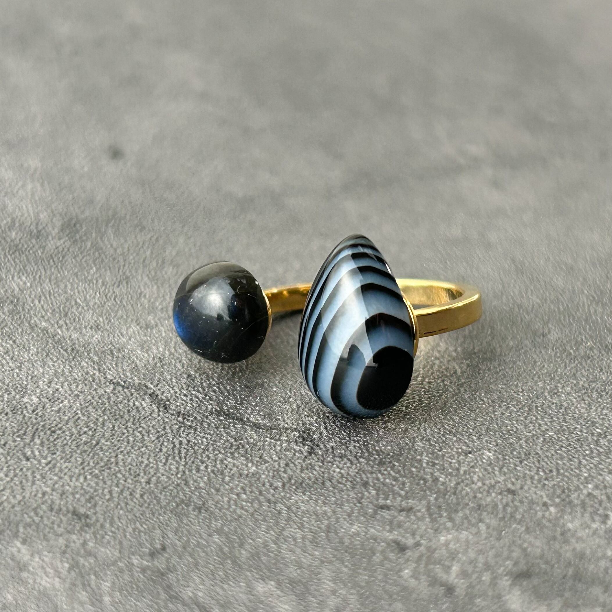 質感の異なる二つのブラック天然石を組み合わせることで、単色では表現できない「奥行き」と「知性」を手元に演出します。