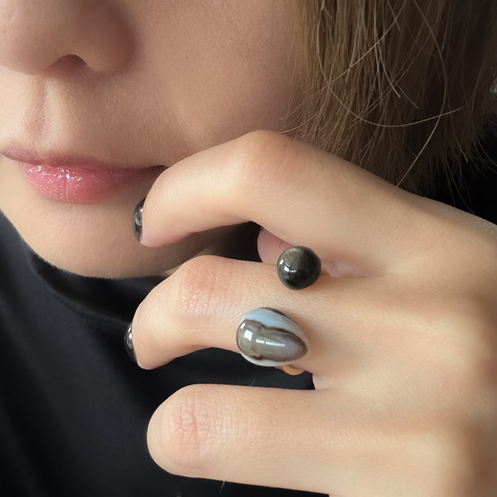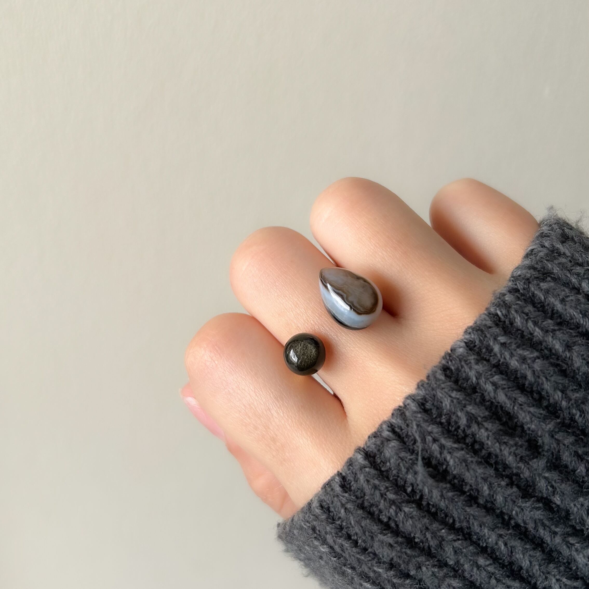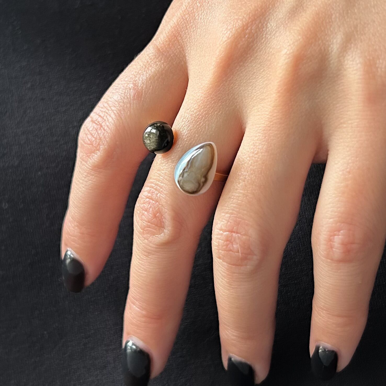 二つの異なる「黒」を、エッジの効いたオープンリングに仕立てました。
