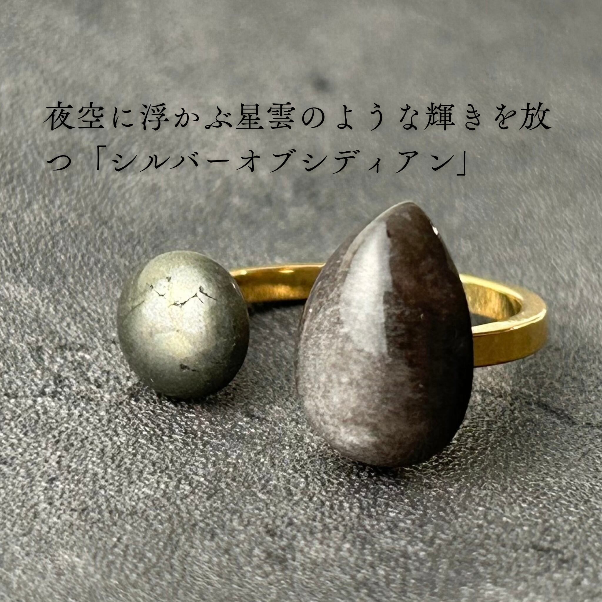 漆黒の中から銀色のシラーが浮かび上がるシルバーオブシディアン。無機質な金属光沢を放つパイライトを添えました。