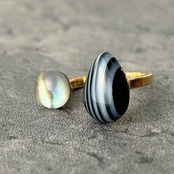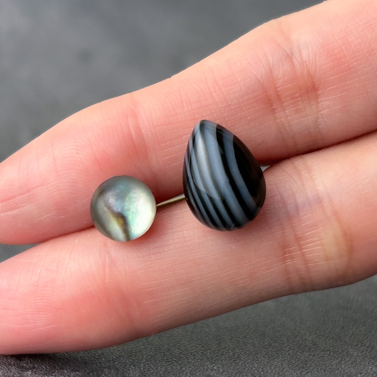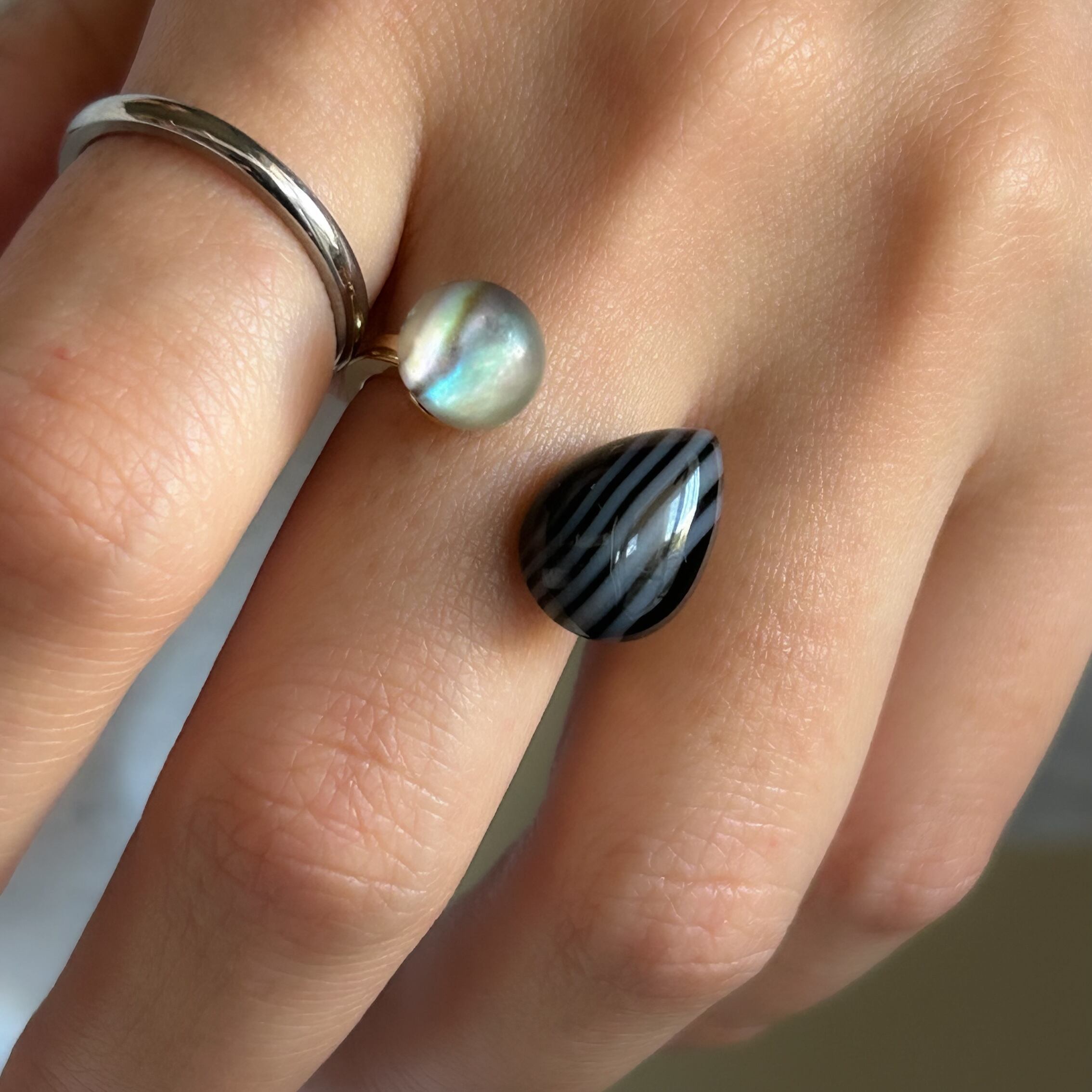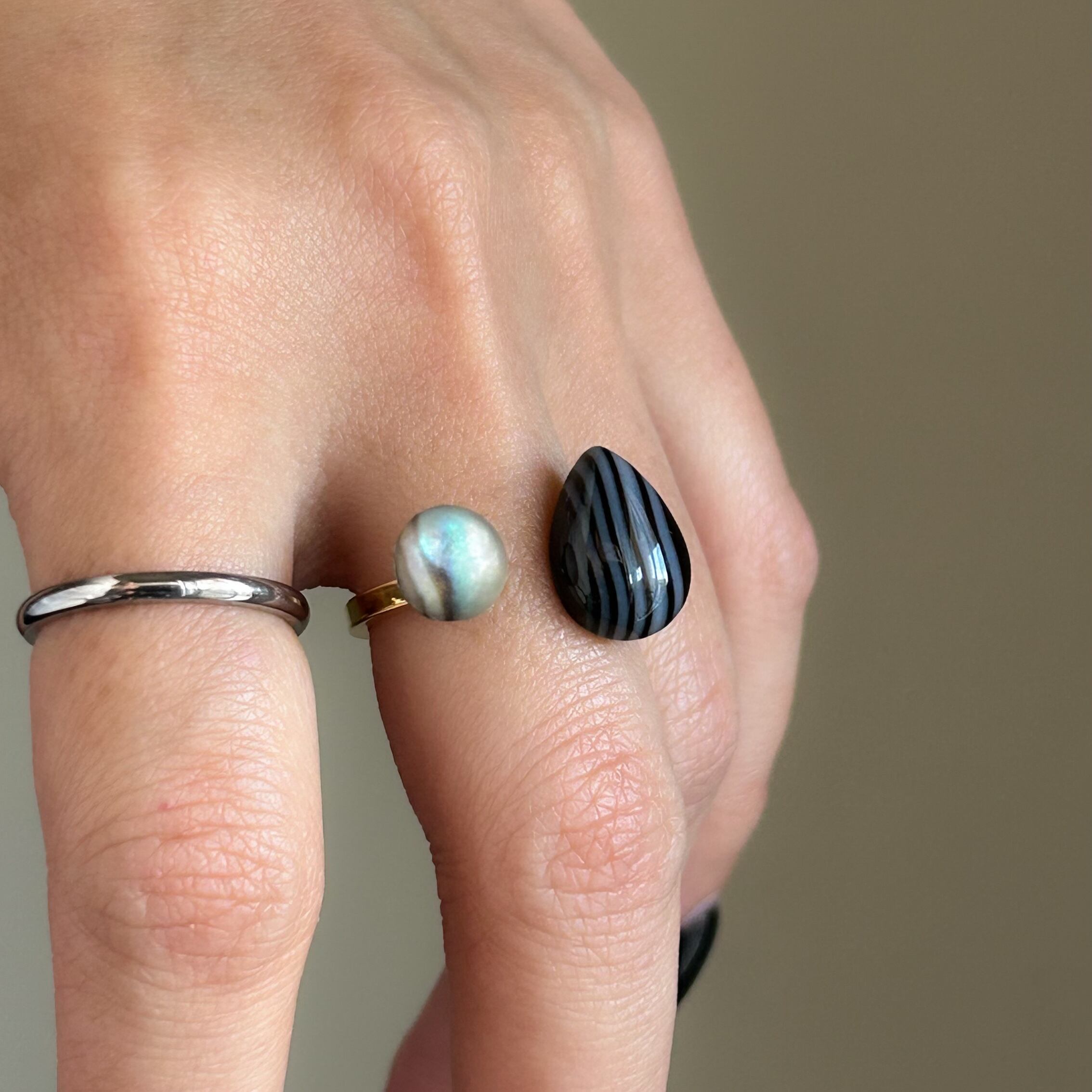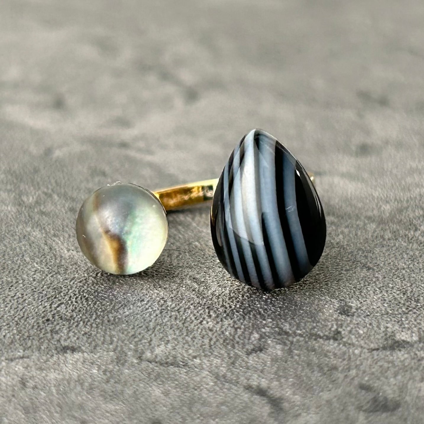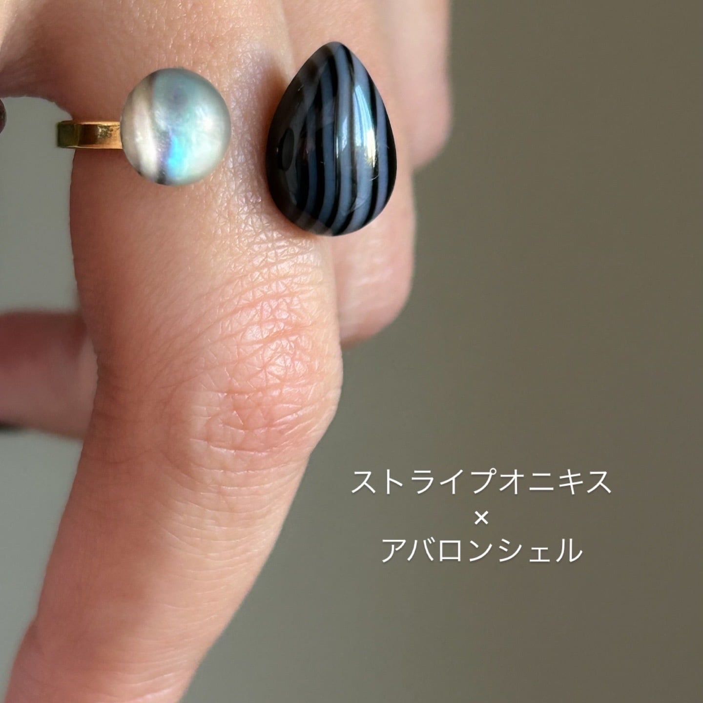 規則正しい層を描くストライプオニキスと、予測不能な色彩を放つアバロンシェル。