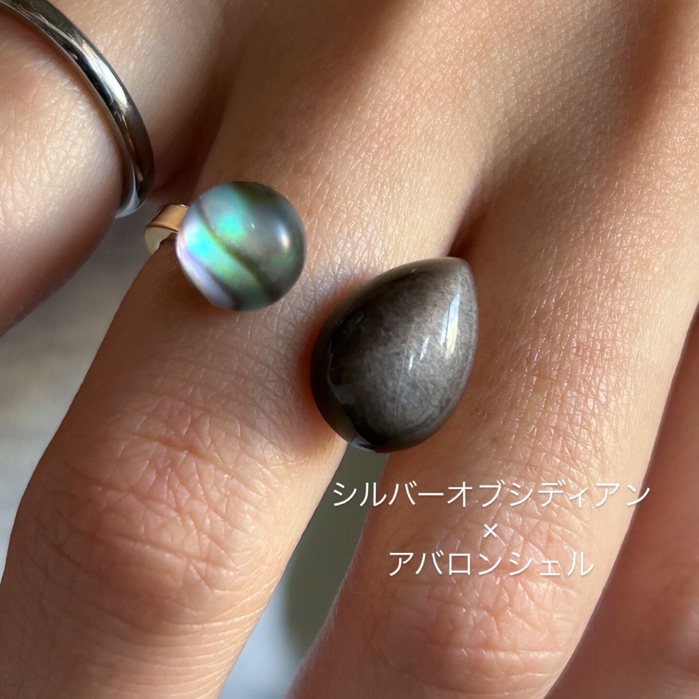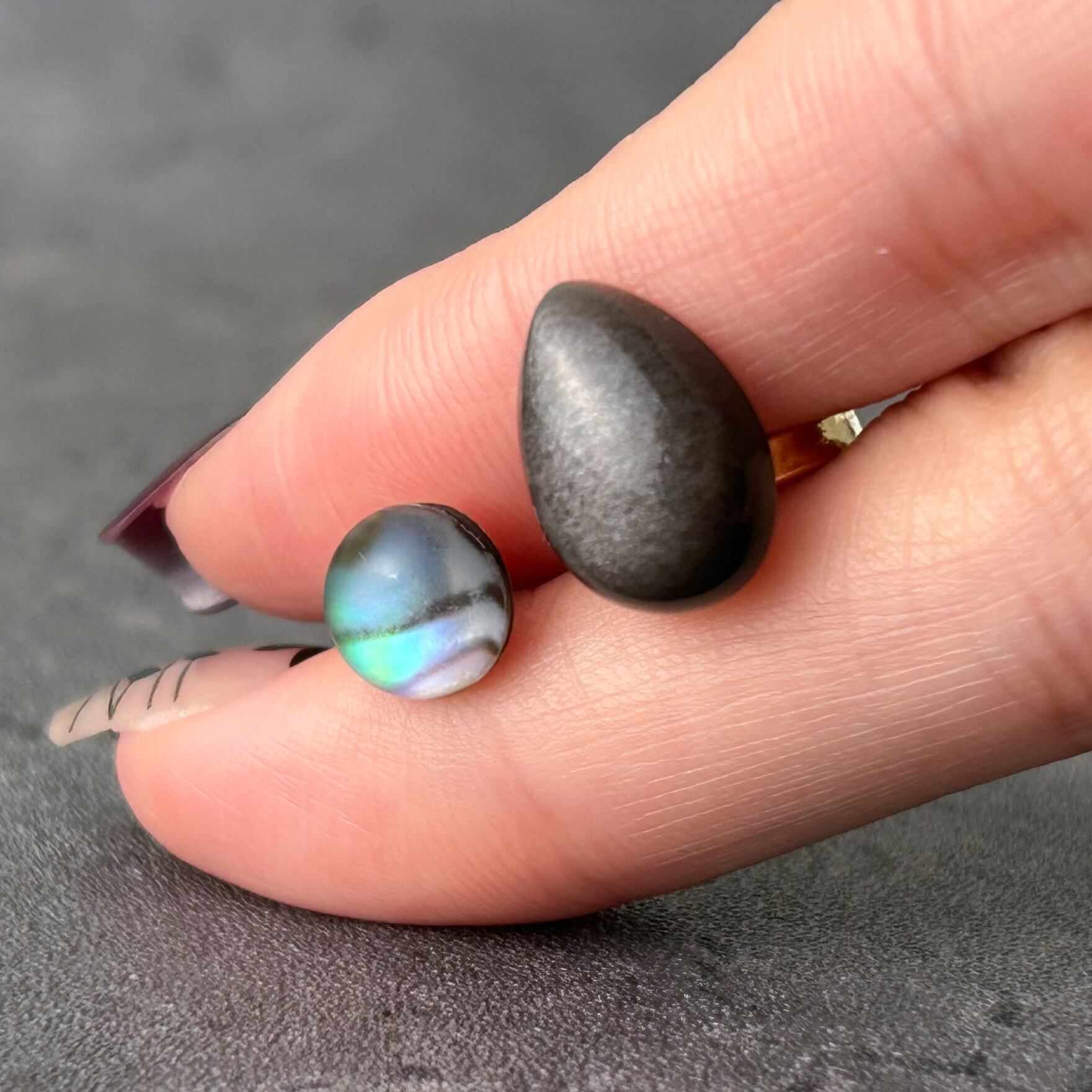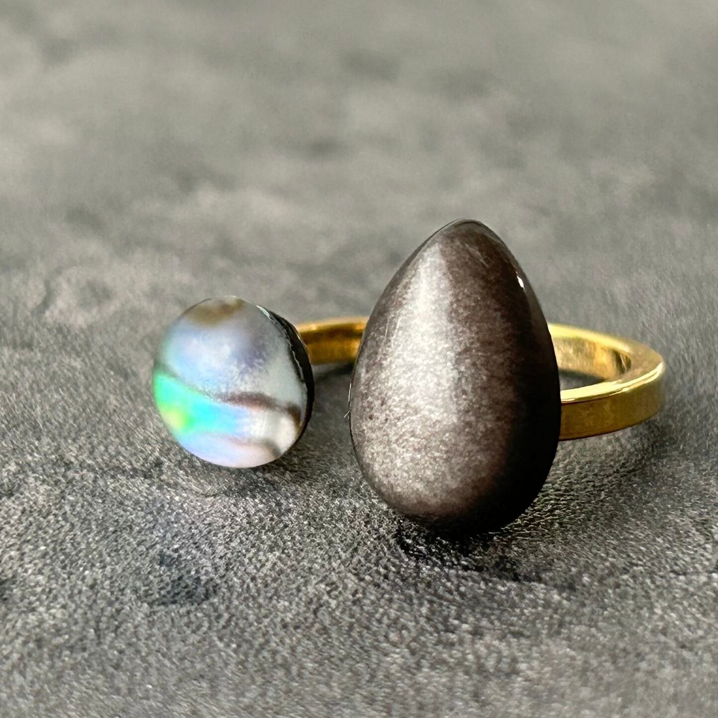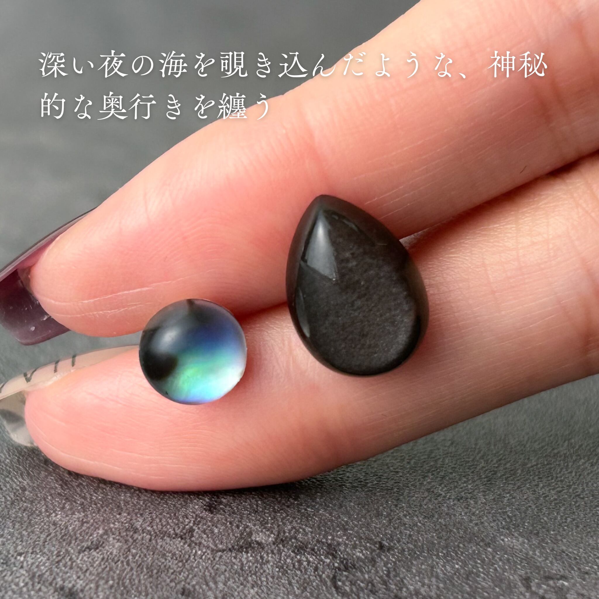 銀の光を孕んだオブシディアンと、虹色の層が幾重にも重なるアバロンシェル。