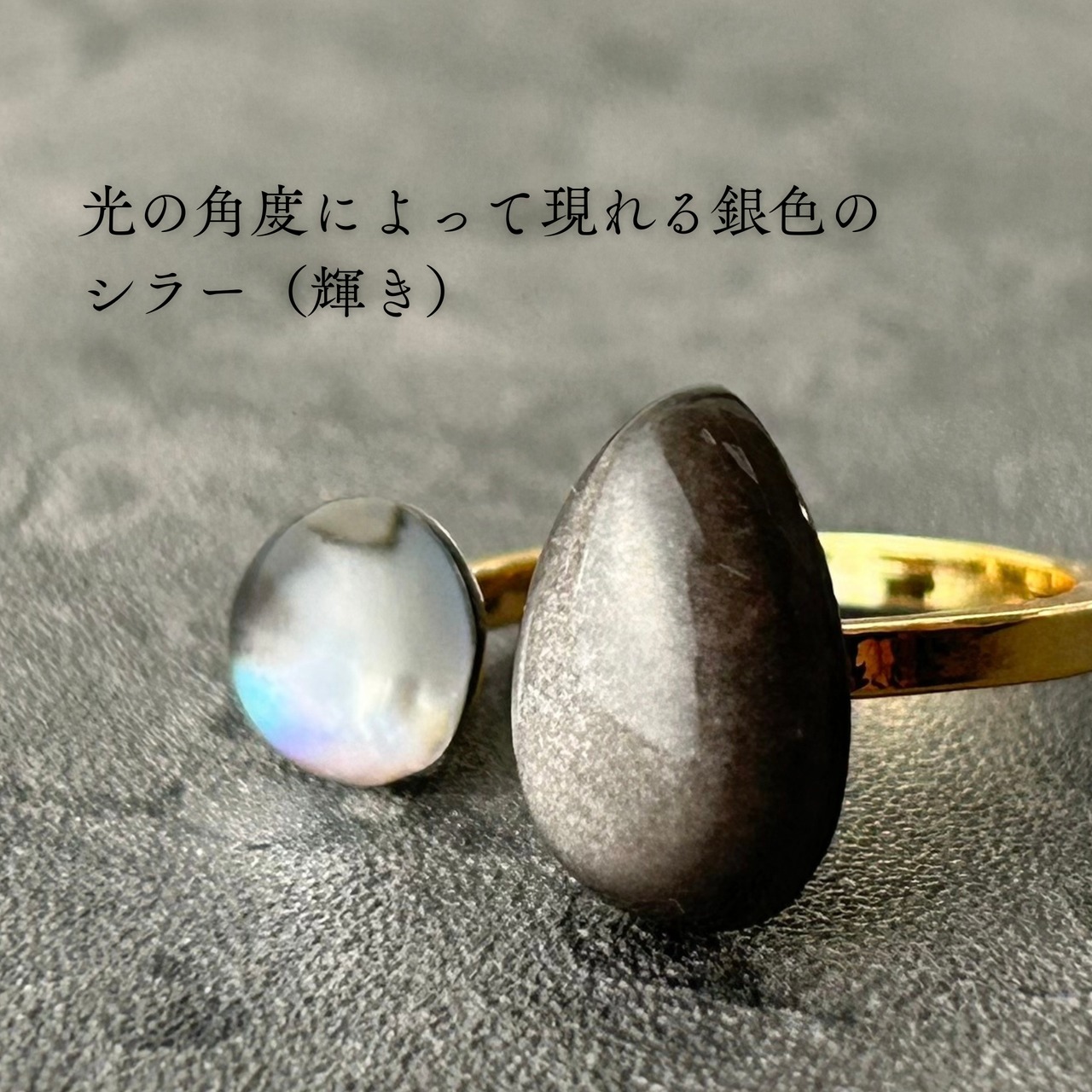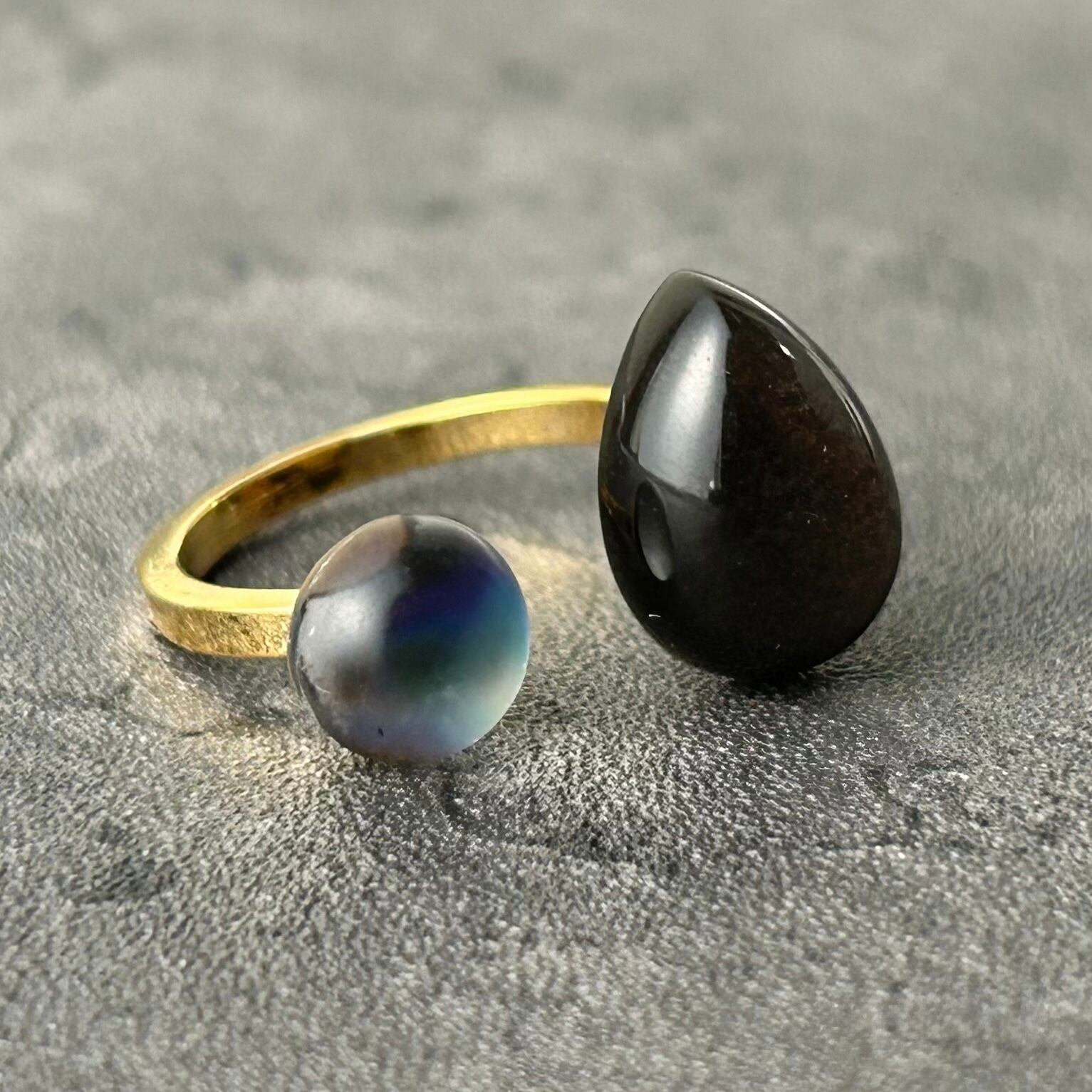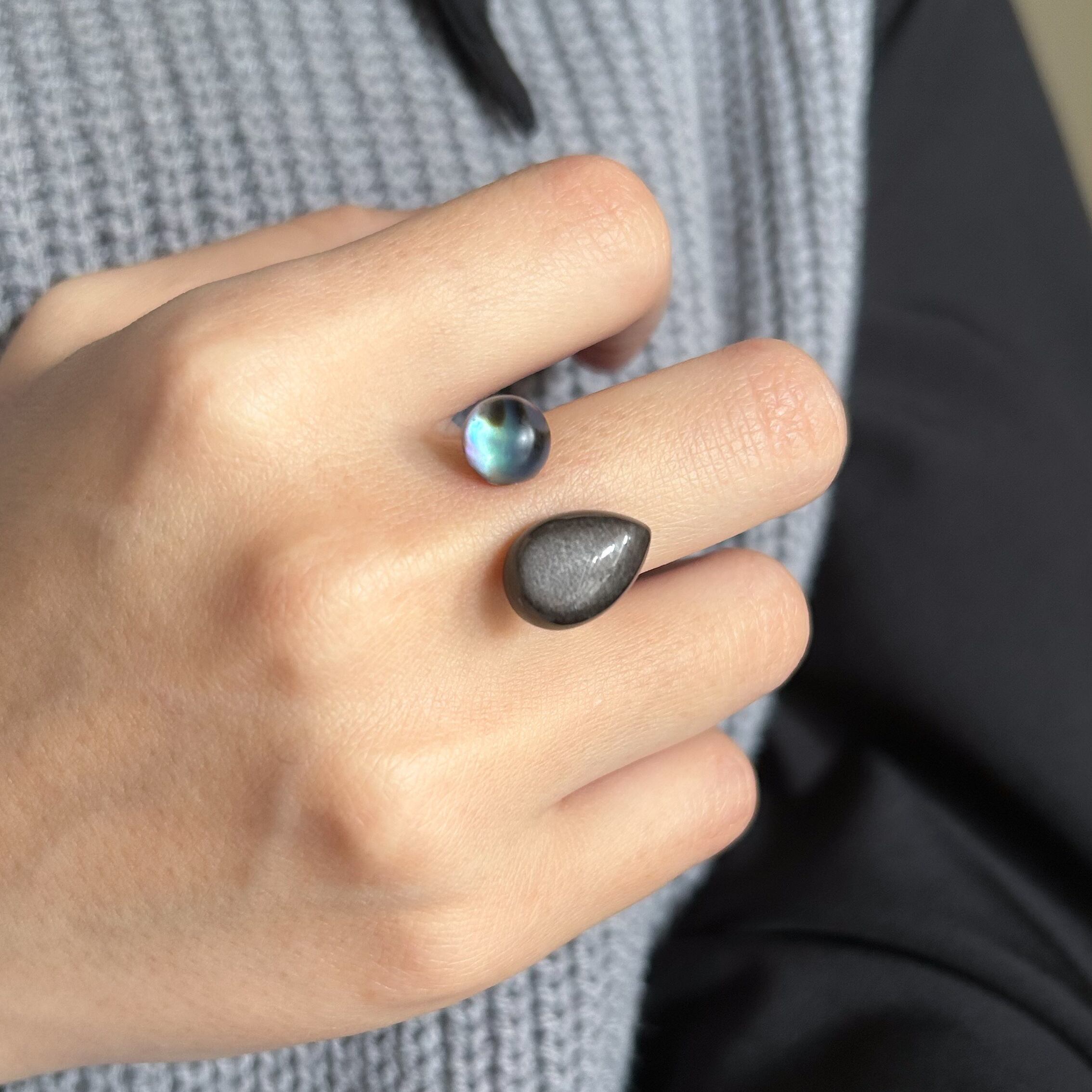 銀の光を孕んだオブシディアンと、虹色の層が幾重にも重なるアバロンシェル。