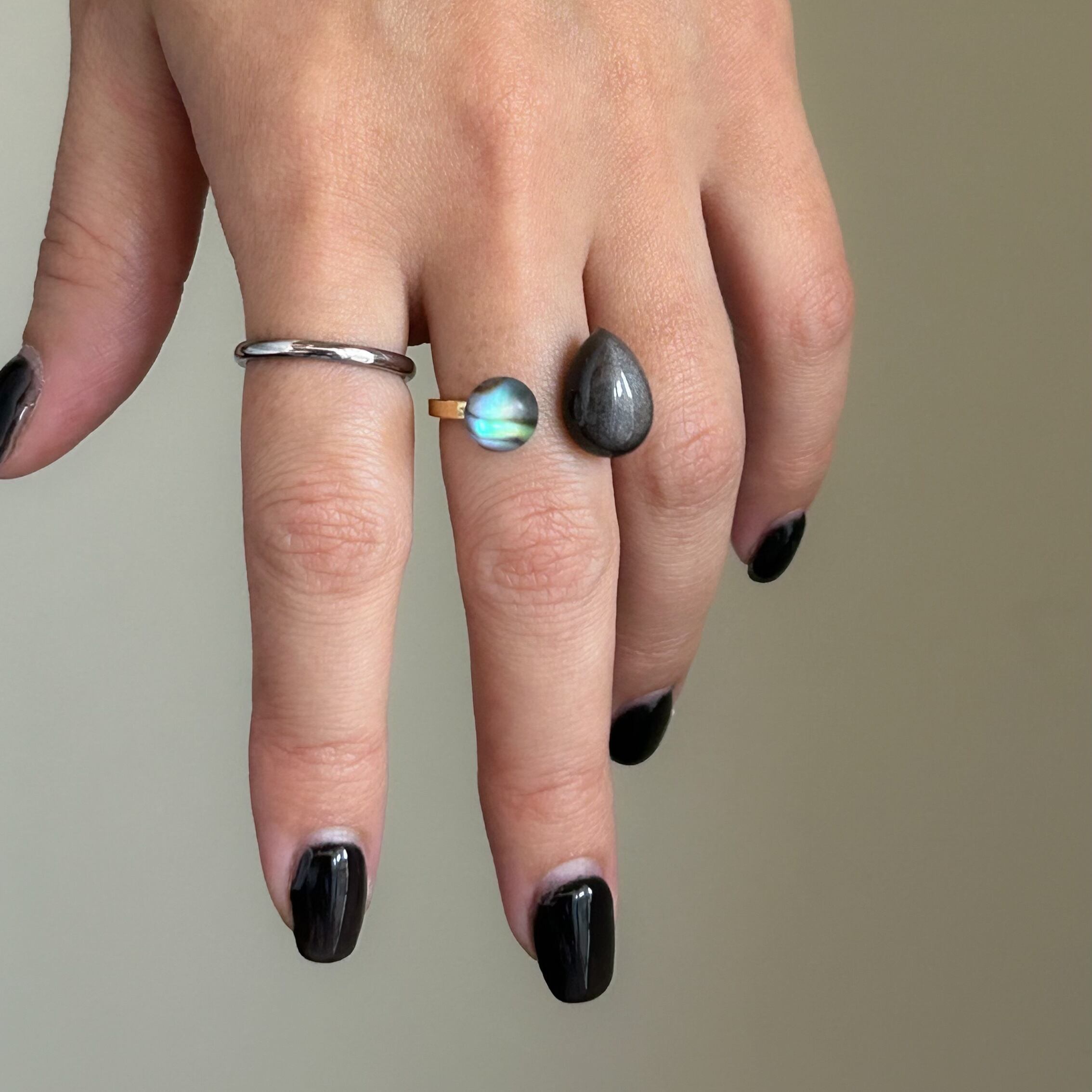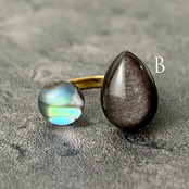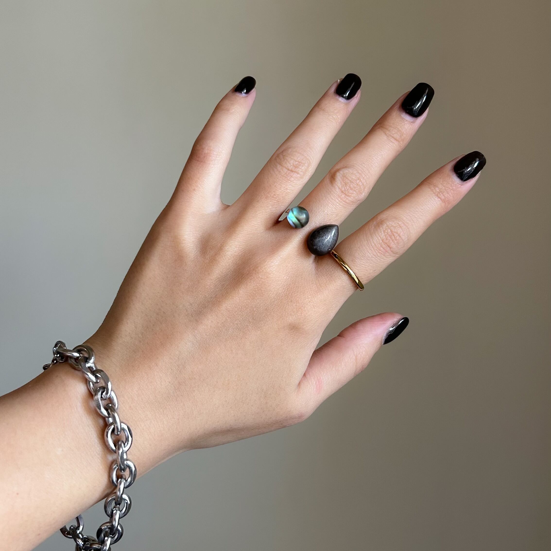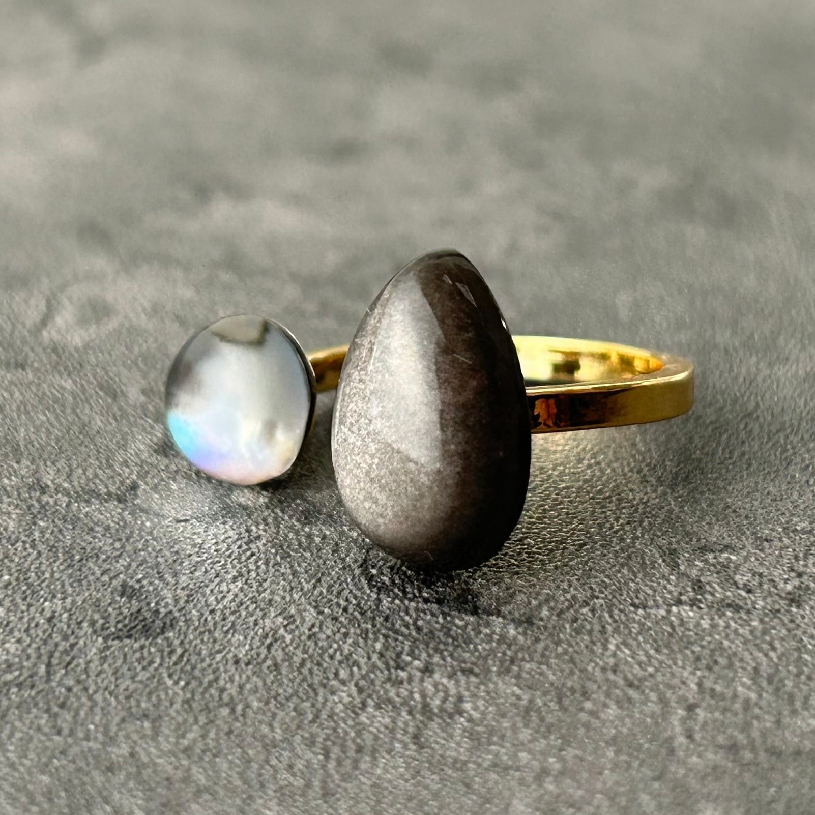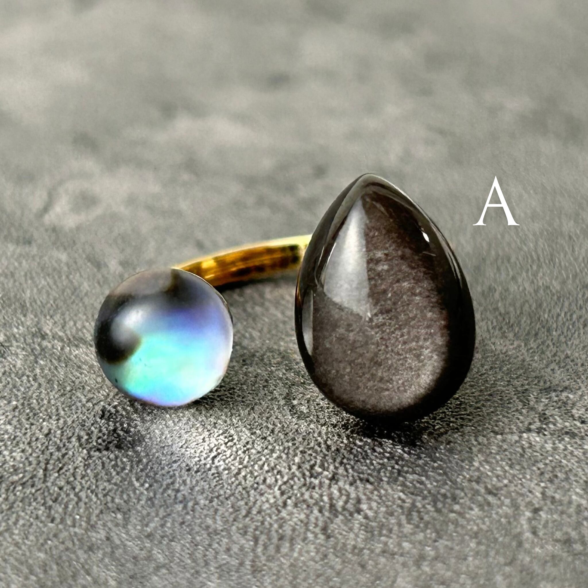 銀の光を孕んだオブシディアンと、虹色の層が幾重にも重なるアバロンシェル。