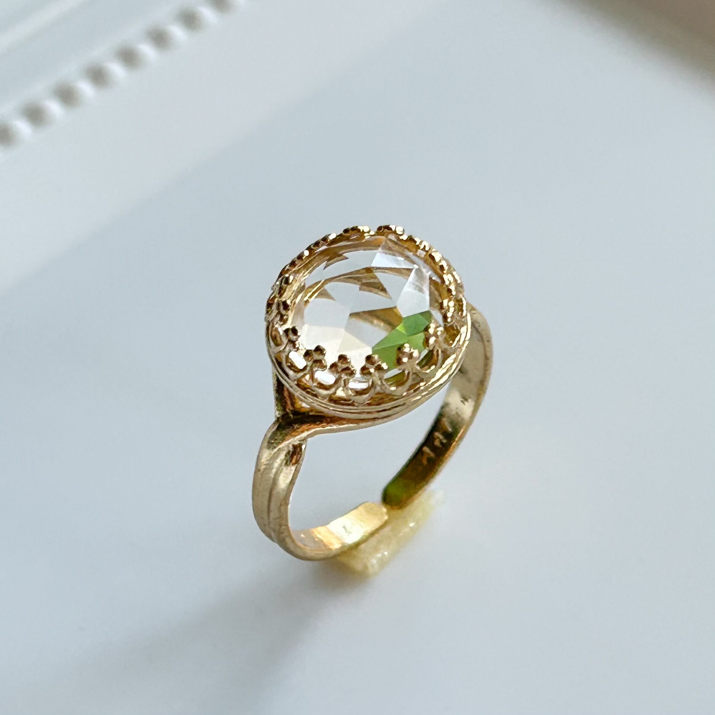 10mmとやや大きめの水晶リングにも関わらず、水晶の透明感がナチュラルに指元に馴染みつつ、アンティーク調なクラウンリングがさり気なくオシャレな手元を演出してくれます。