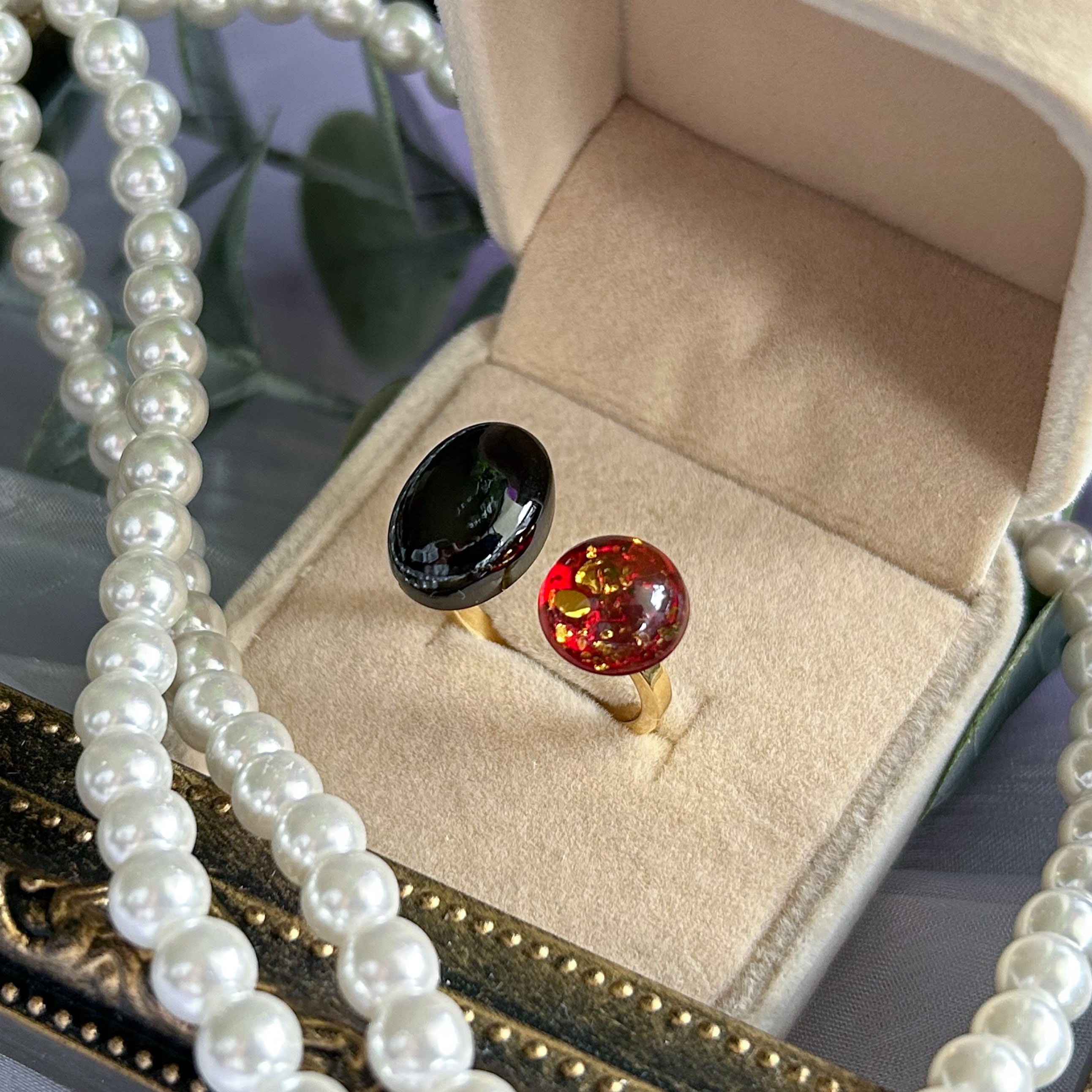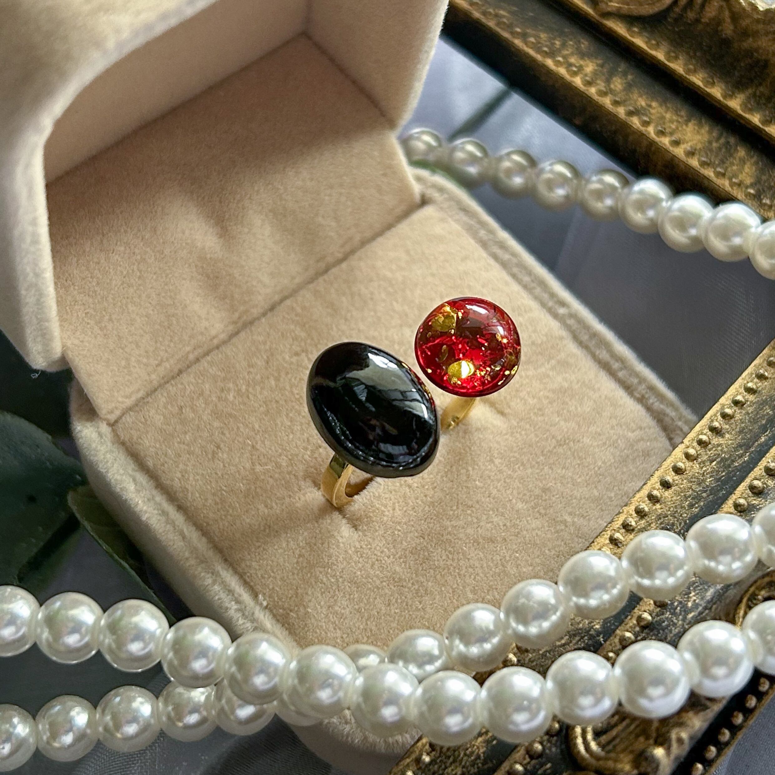深い黒と金色を閉じ込めた鮮やかな赤のコントラストが、スタイリッシュでありながらも和の雰囲気を醸し出すリングです。