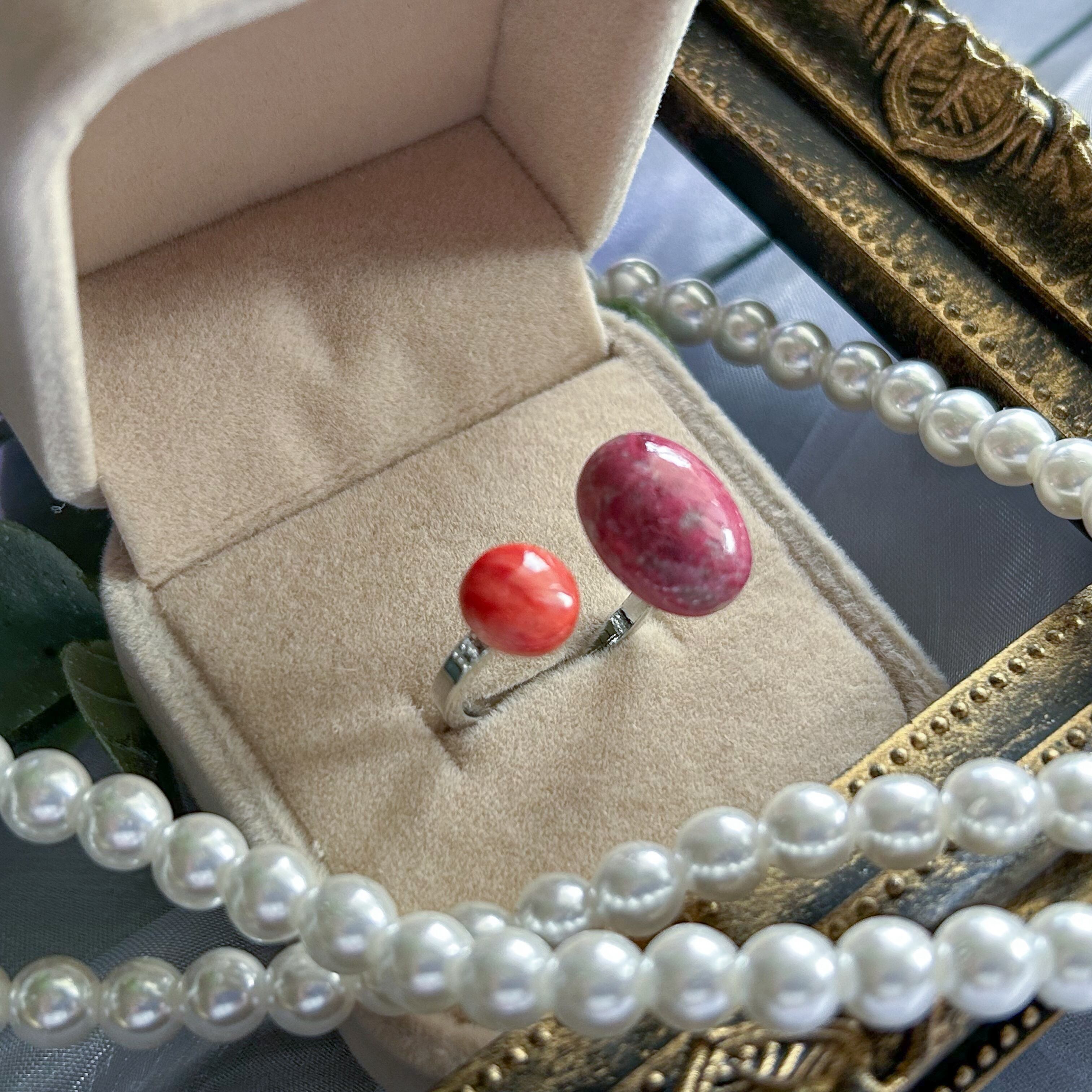 深みのある濃いピンクと鮮やかな朱色の組み合わせが、春の訪れを感じさせる美しいリングに仕上がりました。